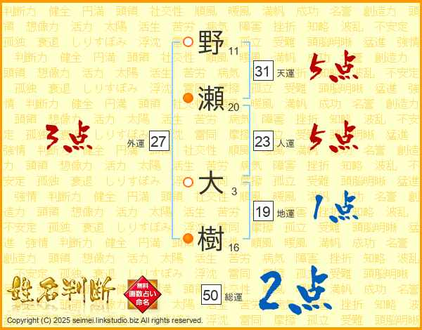 野(11画)瀬(20画) 大(3画)樹(16画)