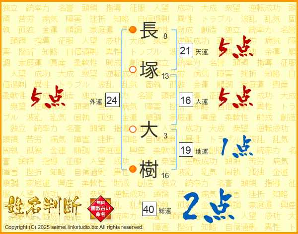 長(8画)塚(13画) 大(3画)樹(16画)