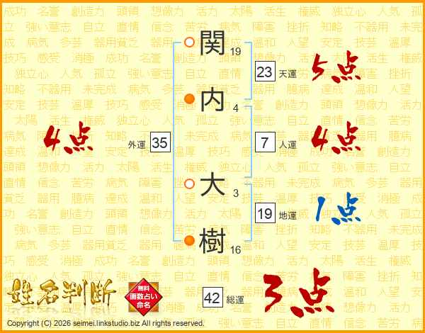 関(19画)内(4画) 大(3画)樹(16画)