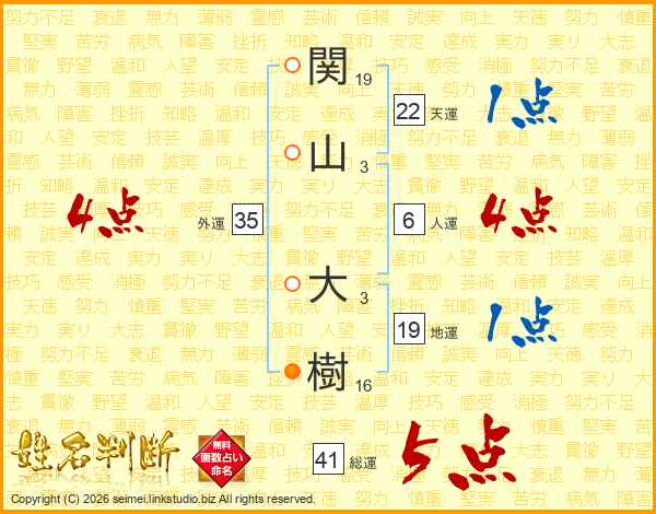 生活面を象徴する運勢です。外部から受ける影響力を表し、結婚運、家庭運や職場、環境への順応性を表します。総運から人運を引いた画数。姓や名が1文字の場合を除く。