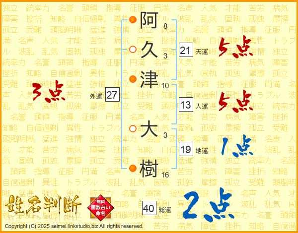阿(8画)久(3画)津(10画) 大(3画)樹(16画)