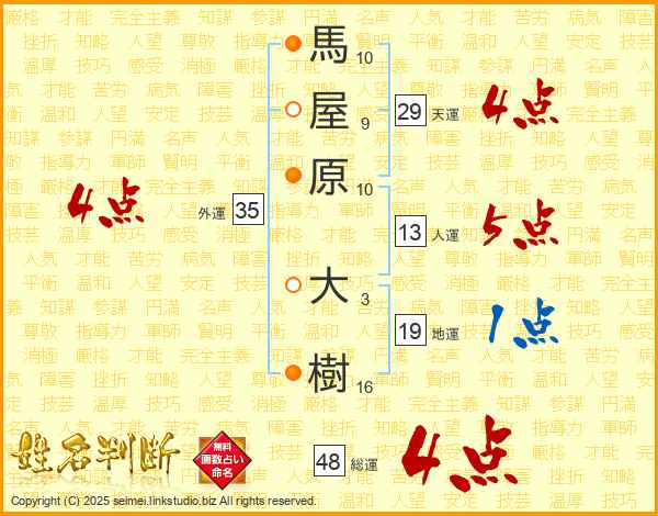 馬(10画)屋(9画)原(10画) 大(3画)樹(16画)
