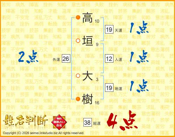 あなたの人生を表す1番重要な運勢です。生涯を通じて影響する総合運となり、主に50歳以降の晩年期に影響を及ぼします。苗字と名前の合計画数。