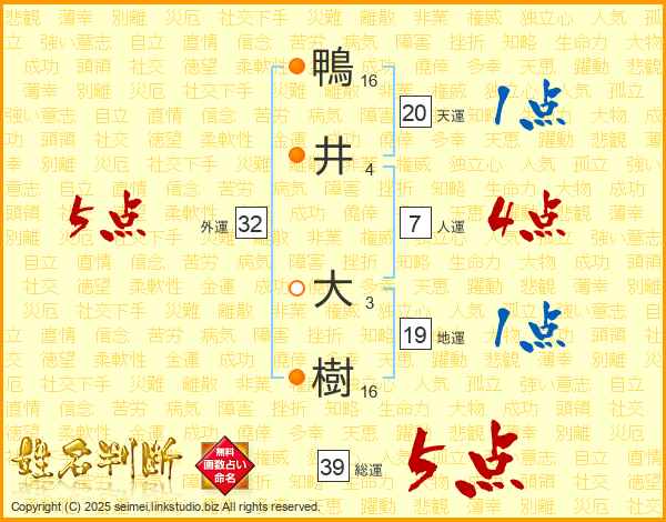 鴨(16画)井(4画)  大(3画)樹(16画)