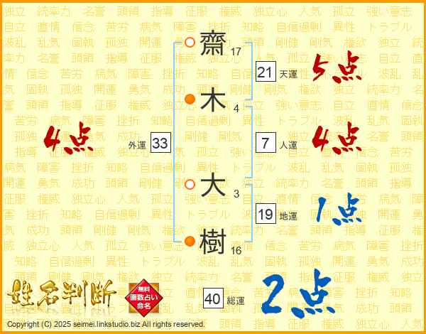 生活面を象徴する運勢です。外部から受ける影響力を表し、結婚運、家庭運や職場、環境への順応性を表します。総運から人運を引いた画数。姓や名が1文字の場合を除く。