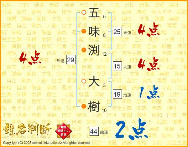 五(5画)味(8画)渕(12画) 大(3画)樹(16画)
