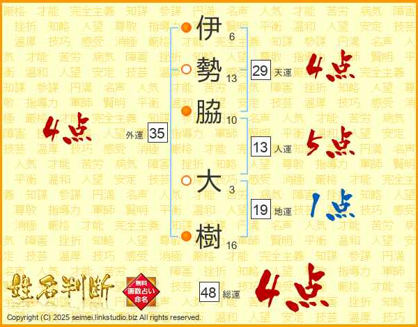 伊(6画)勢(13画)脇(10画) 大(3画)樹(16画)