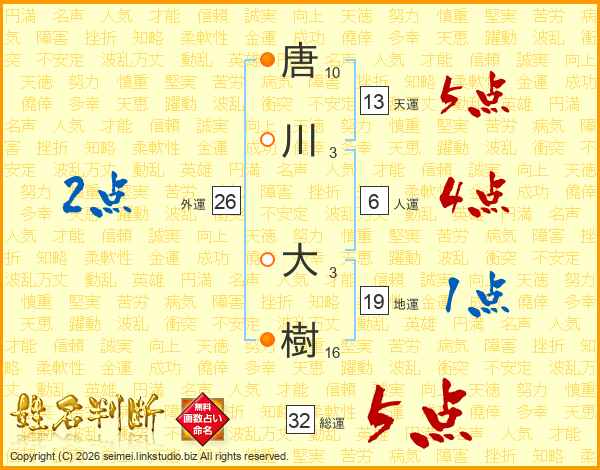 生活面を象徴する運勢です。外部から受ける影響力を表し、結婚運、家庭運や職場、環境への順応性を表します。総運から人運を引いた画数。姓や名が1文字の場合を除く。