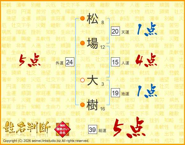 生活面を象徴する運勢です。外部から受ける影響力を表し、結婚運、家庭運や職場、環境への順応性を表します。総運から人運を引いた画数。姓や名が1文字の場合を除く。