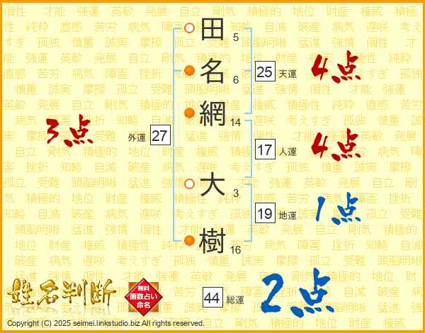 田(5画)名(6画)網(14画) 大(3画)樹(16画)