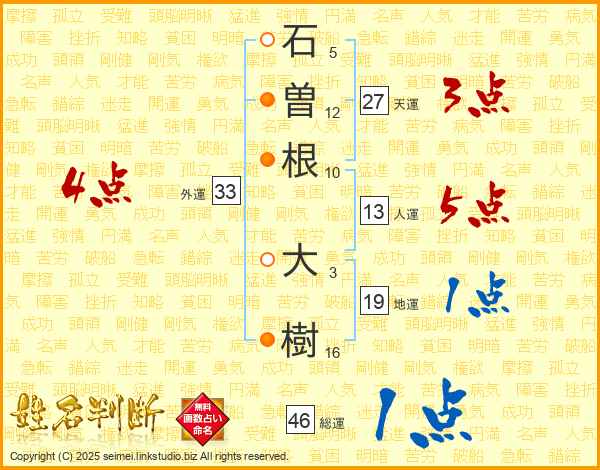 石(5画)曽(12画)根(10画) 大(3画)樹(16画)