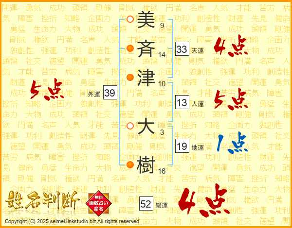 美(9画)斉(14画)津(10画) 大(3画)樹(16画)