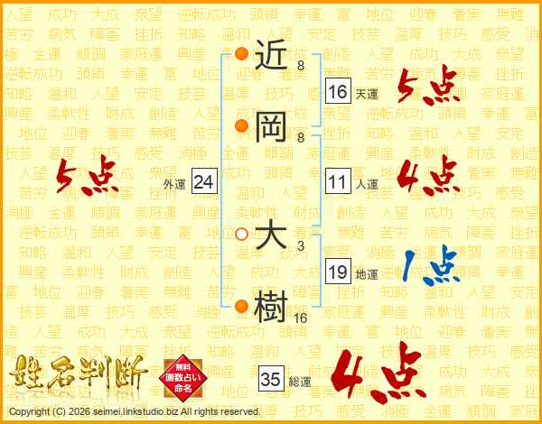 あなたの人生を表す1番重要な運勢です。生涯を通じて影響する総合運となり、主に50歳以降の晩年期に影響を及ぼします。苗字と名前の合計画数。
