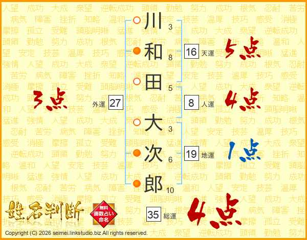 川(3画)和(8画)田(5画) 大(3画)次(6画)郎(10画)