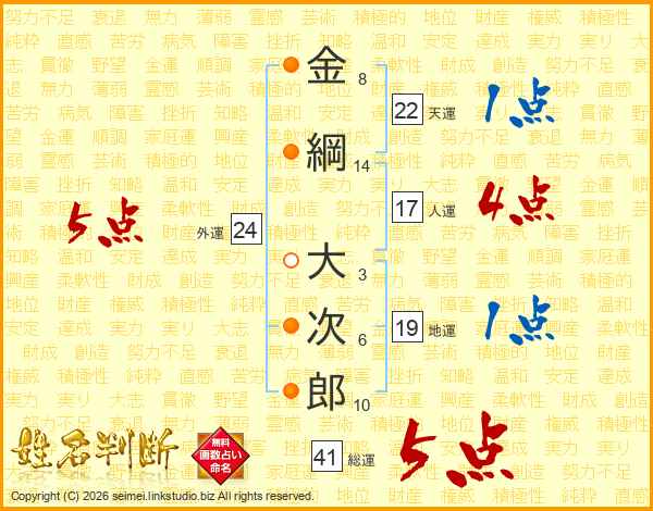 金綱大次郎さんの総運は41画の5点!
