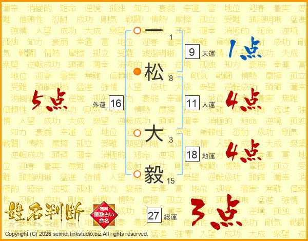 あなたの人生を表す1番重要な運勢です。生涯を通じて影響する総合運となり、主に50歳以降の晩年期に影響を及ぼします。苗字と名前の合計画数。