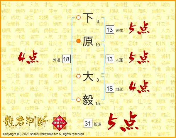 あなたの人生を表す1番重要な運勢です。生涯を通じて影響する総合運となり、主に50歳以降の晩年期に影響を及ぼします。苗字と名前の合計画数。