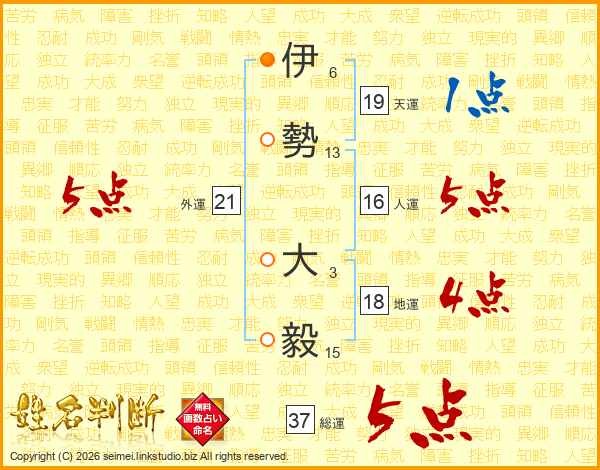 伊(6画)勢(13画) 大(3画)毅(15画)