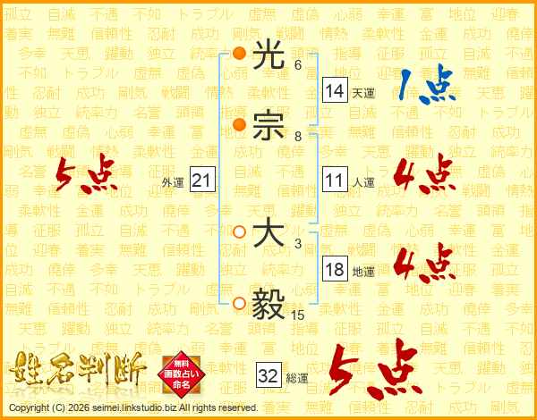 生活面を象徴する運勢です。外部から受ける影響力を表し、結婚運、家庭運や職場、環境への順応性を表します。総運から人運を引いた画数。姓や名が1文字の場合を除く。