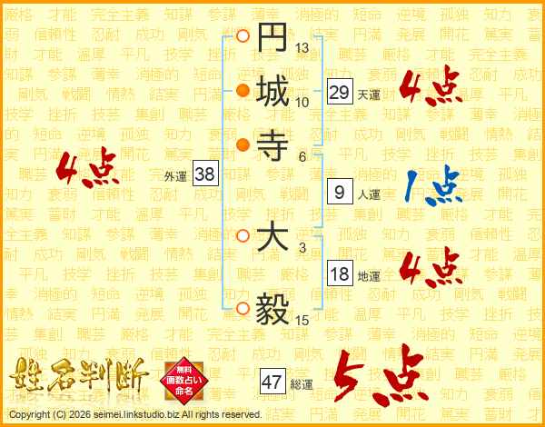 円(13画)城(10画)寺(6画) 大(3画)毅(15画)