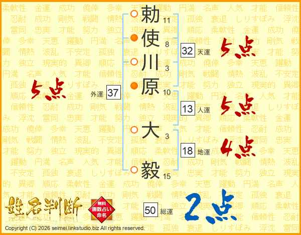 勅(11画)使(8画)川(3画)原(10画) 大(3画)毅(15画)