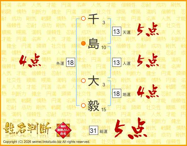 千(3画)島(10画) 大(3画)毅(15画)