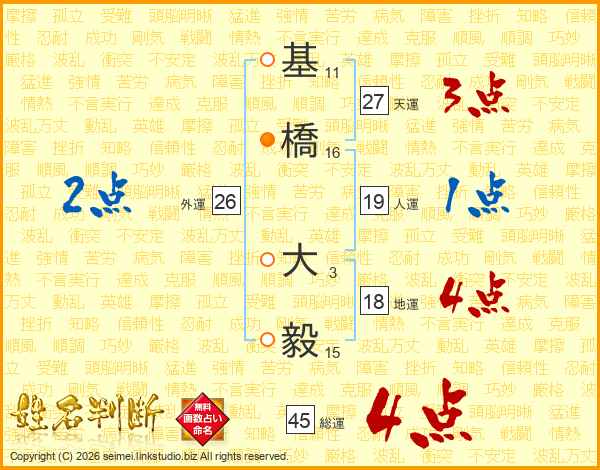 基(11画)橋(16画) 大(3画)毅(15画)