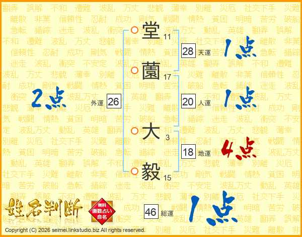 堂(11画)薗(17画) 大(3画)毅(15画)