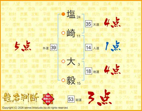 塩(24画)崎(11画) 大(3画)毅(15画)