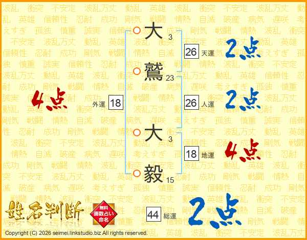大(3画)鷲(23画) 大(3画)毅(15画)