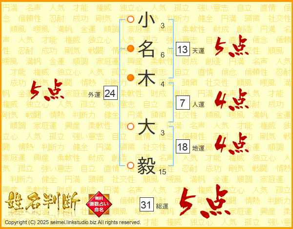 小(3画)名(6画)木(4画) 大(3画)毅(15画)