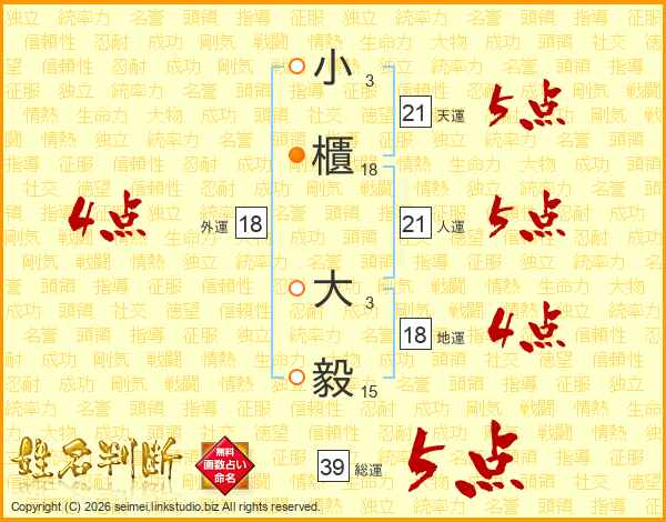 小櫃大毅さんの総運は39画の5点!