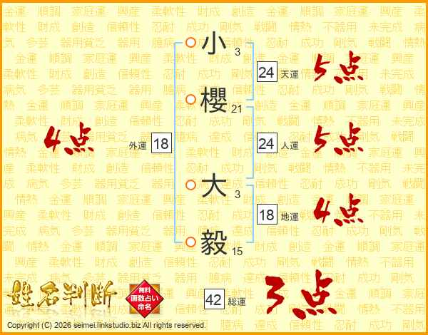 小(3画)櫻(21画) 大(3画)毅(15画)