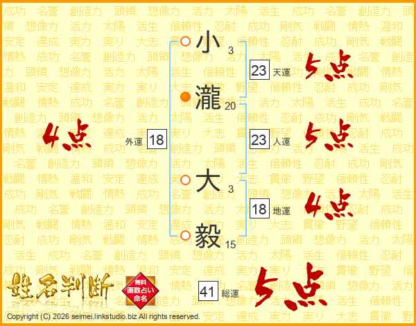 小(3画)瀧(20画) 大(3画)毅(15画)