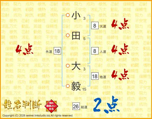 生活面を象徴する運勢です。外部から受ける影響力を表し、結婚運、家庭運や職場、環境への順応性を表します。総運から人運を引いた画数。姓や名が1文字の場合を除く。
