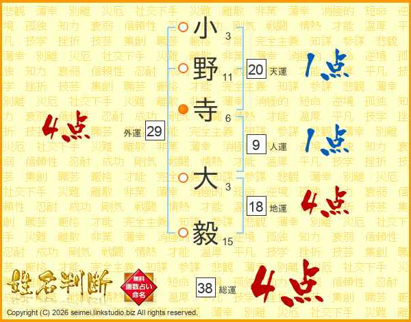 小(3画)野(11画)寺(6画) 大(3画)毅(15画)