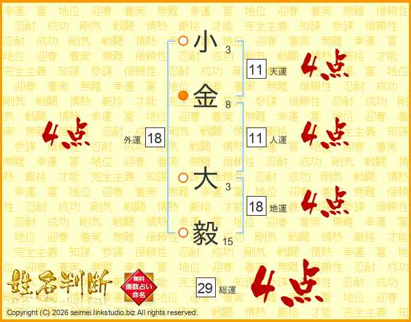 あなたの人生を表す1番重要な運勢です。生涯を通じて影響する総合運となり、主に50歳以降の晩年期に影響を及ぼします。苗字と名前の合計画数。