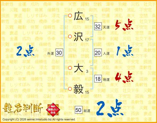 生活面を象徴する運勢です。外部から受ける影響力を表し、結婚運、家庭運や職場、環境への順応性を表します。総運から人運を引いた画数。姓や名が1文字の場合を除く。