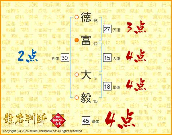 徳(15画)富(12画) 大(3画)毅(15画)