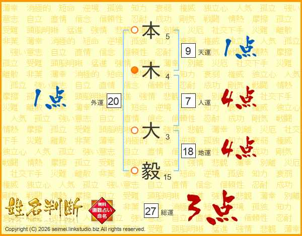 あなたの人生を表す1番重要な運勢です。生涯を通じて影響する総合運となり、主に50歳以降の晩年期に影響を及ぼします。苗字と名前の合計画数。
