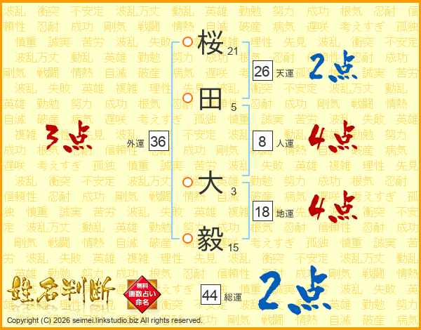 あなたの人生を表す1番重要な運勢です。生涯を通じて影響する総合運となり、主に50歳以降の晩年期に影響を及ぼします。苗字と名前の合計画数。