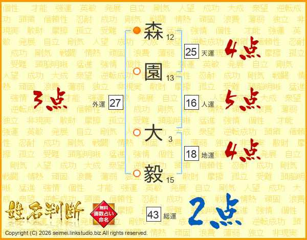 あなたの人生を表す1番重要な運勢です。生涯を通じて影響する総合運となり、主に50歳以降の晩年期に影響を及ぼします。苗字と名前の合計画数。