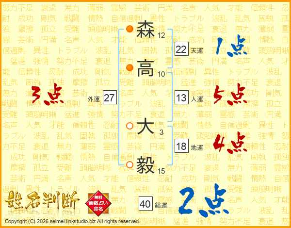 森(12画)高(10画) 大(3画)毅(15画)