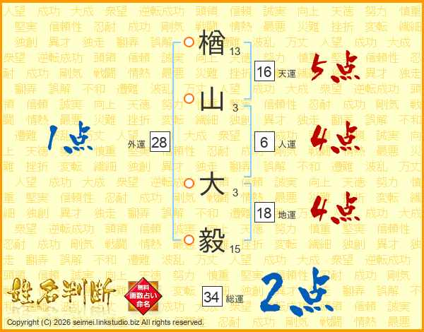 あなたの人生を表す1番重要な運勢です。生涯を通じて影響する総合運となり、主に50歳以降の晩年期に影響を及ぼします。苗字と名前の合計画数。