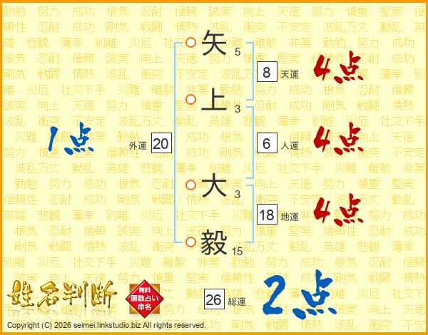 生活面を象徴する運勢です。外部から受ける影響力を表し、結婚運、家庭運や職場、環境への順応性を表します。総運から人運を引いた画数。姓や名が1文字の場合を除く。