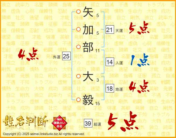 矢(5画)加(5画)部(11画) 大(3画)毅(15画)