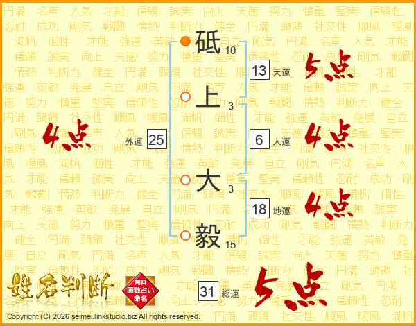 砥上大毅さんの総運は31画の5点!