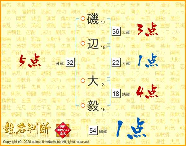 磯(17画)辺(19画) 大(3画)毅(15画)