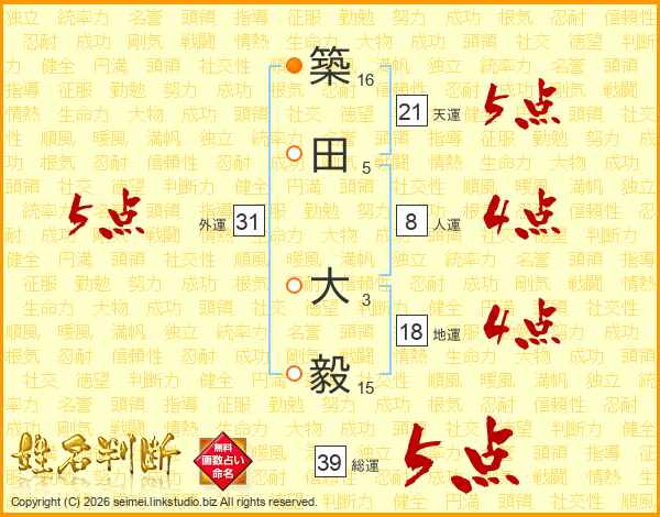 築(16画)田(5画) 大(3画)毅(15画)