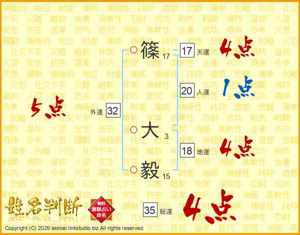 生活面を象徴する運勢です。外部から受ける影響力を表し、結婚運、家庭運や職場、環境への順応性を表します。総運から人運を引いた画数。姓や名が1文字の場合を除く。